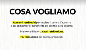Noi vogliamo aumenti retributivi per tutelare il potere d’acquisto, meno ore di lavoro a parità di retribuzione e maggiore formazione per operai e impiegati.